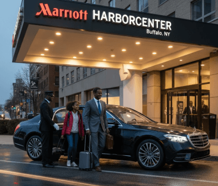 During major arena events in Buffalo, rideshare wait times increase and vehicle availability becomes limited. Reserving your Buffalo Airport to Buffalo Marriott at LECOM HARBORCENTER black car service in advance guarantees your pickup is scheduled before your flight arrives.